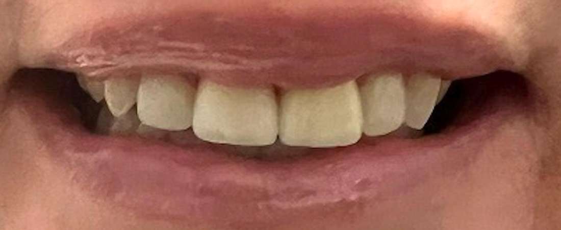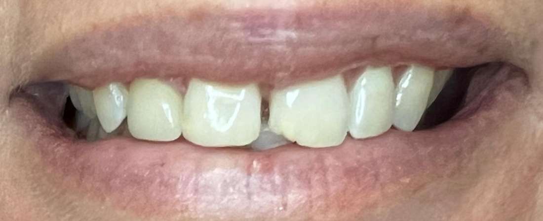 This lovely lady came to us with two concerns. She didn't like the gap between her two front teeth, and had also chipped one of them. There are a few different things we could have done here, and she eventually opted for porcelain (ceramic) veneers. Dr Georgia designed the veneers so they'd close the space at the front, as well as improving the contour of the teeth. Our patient was delighted.
